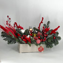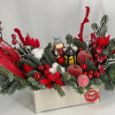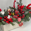 Настольная новогодняя композиция из живой хвои нобилис в деревянном кашпо с сувениром