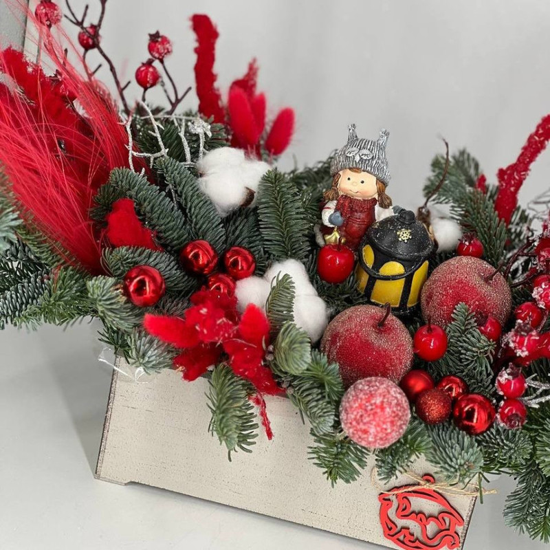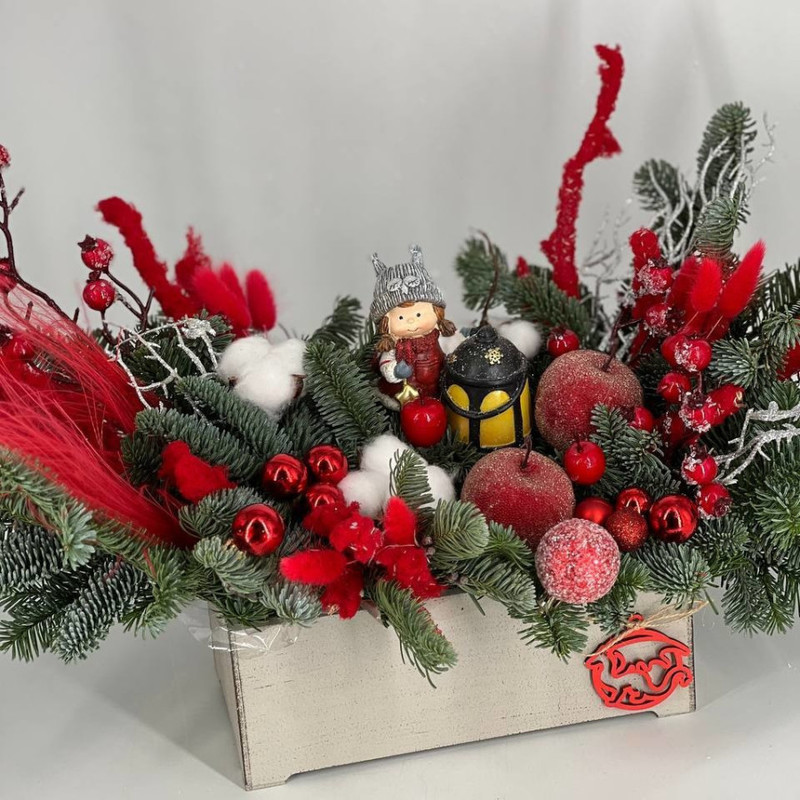 Новогодняя композиция из веток натурального нобилиса, с красивым декором и сувениром в виде девочки с фонарём, это отличная идея для подарка на Новогодние и Рождественские праздники. Зимние букеты — необычные флористические композиции, способные скрасить морозные будни, окутать теплом и уютом. Красивый еловый букетик станет прекрасным новогодним подарком, оригинальным презентом на день рождения коллеге или близкому человеку. Многогранные композиции создают праздничную атмосферу, наполняя дом необычайными хвойными и пряными ароматами.