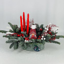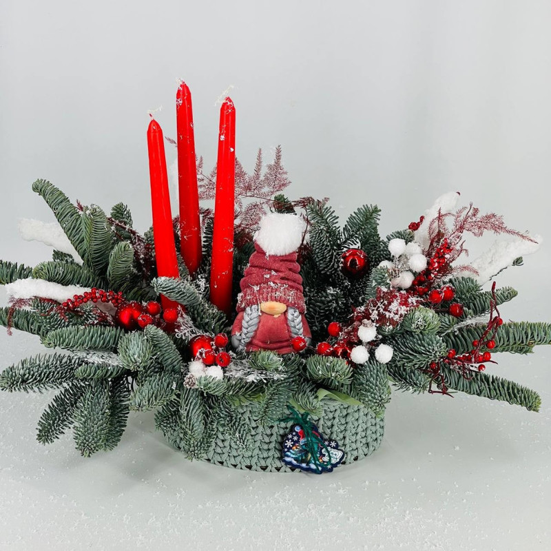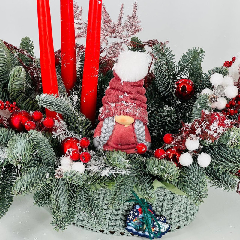 Такая композиция будет отлично смотреться в ресторане, кафе, галерее и любом другом помещении общественного пользования. Новогодняя композиция на стол из натуральной хвои, усыпанная декором, со свечами и с сувениром в виде гнома, станет идеальным дополнением к новогоднему столу.