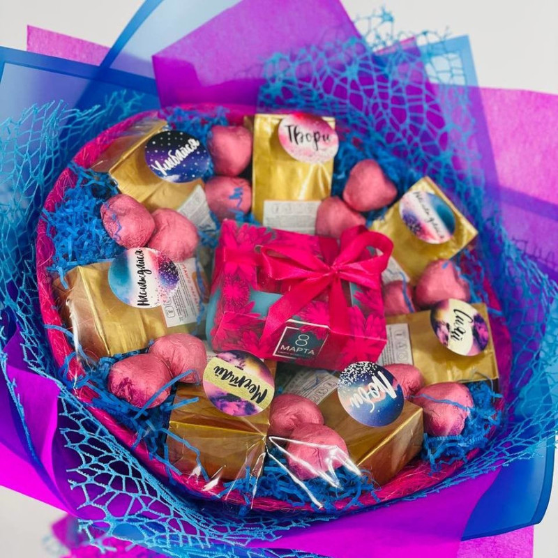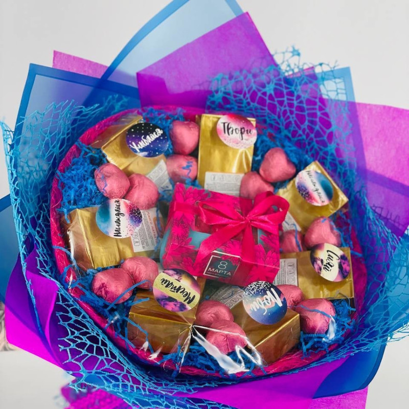 Букет из чая и шоколадных сердец подарок на 8 марта