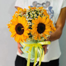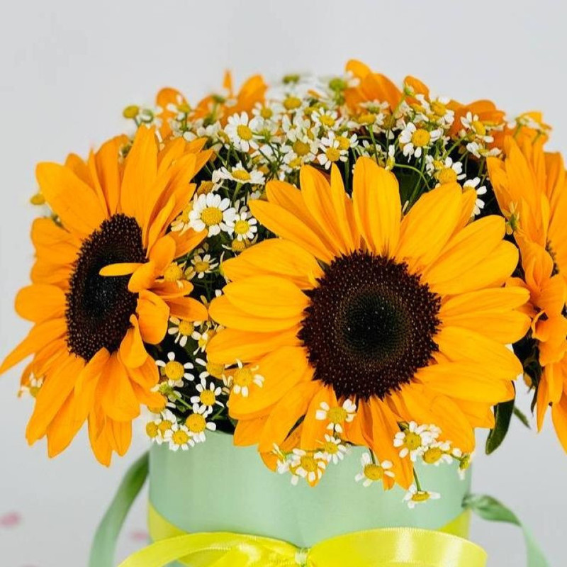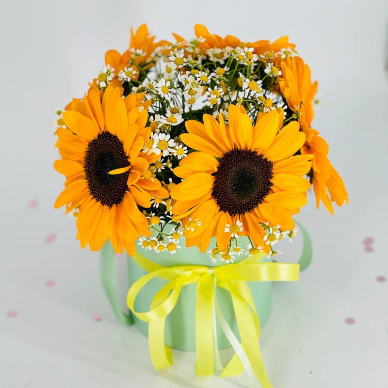 Шляпная коробка с подсолнухами и полевыми ромашками танацетум