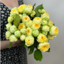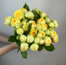 Букет состоит из семи кустовых роз желтого цвета, что придает ему яркость и насыщенность. Розы собраны на стеблях, что позволяет им сохранять свою форму и свежесть на протяжении долгого времени.