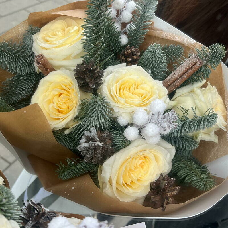 - Зимний букет с пионовидной белой розой