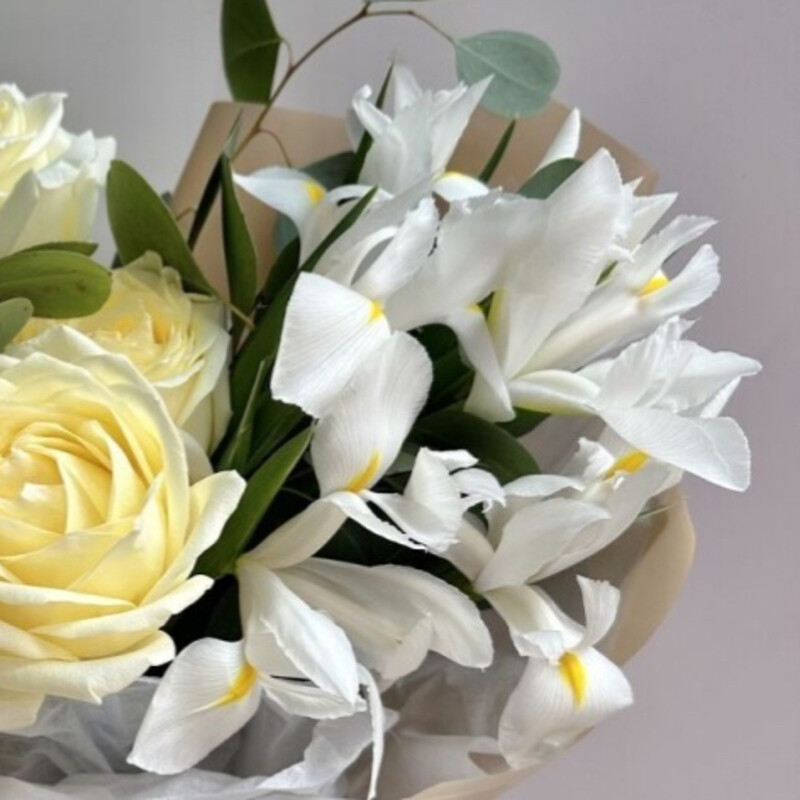 Авторский букет «Ириска» — изысканная композиция из ириса и розы, дополненная эвкалиптом. Элегантная упаковка с атласной лентой придаёт букету завершённый вид. Подходит для любых случаев и идеален в качестве подарка для близких и друзей
