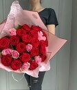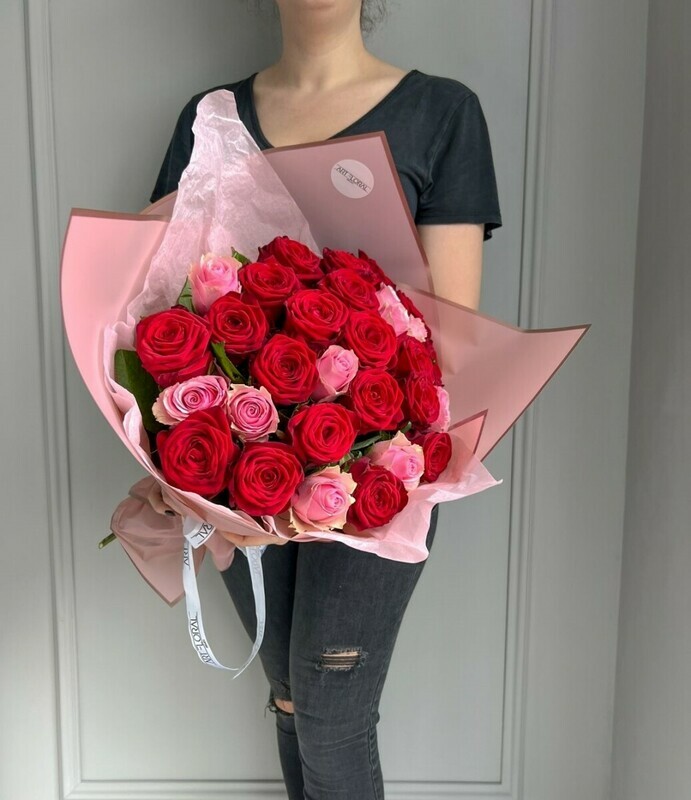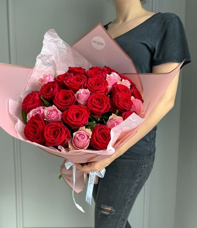 Этот букет — застывший рассвет вашей любви. Глубокие красные розы — это жар полуденного солнца, сила и энергия ваших чувств. А нежные розовые — это утренняя прохлада, мягкость и свежесть, которая живёт в сердце рядом с любимой.