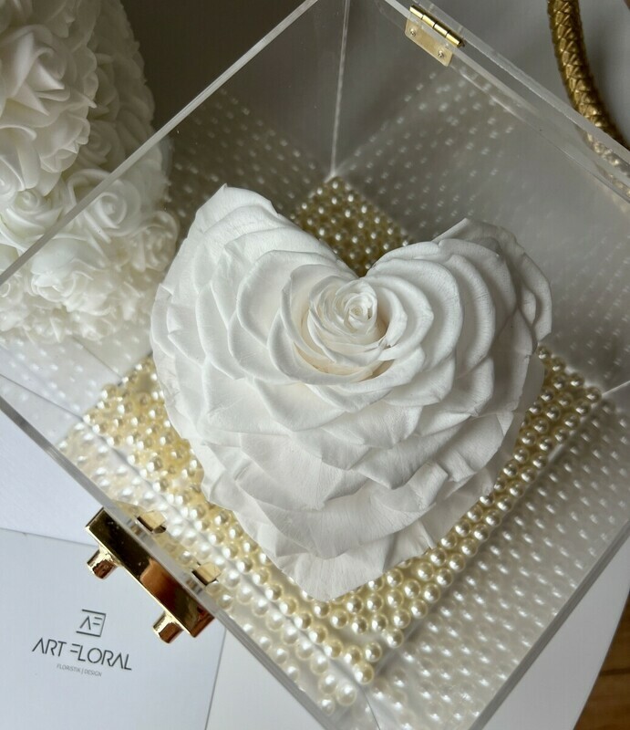 Изысканная дизайнерская композиция, воплощающая чистоту, элегантность и благородство. Внутри идеально прозрачного акрилового куба заключено сердце, искусно собранное из лепестков стабилизированной белой розы.