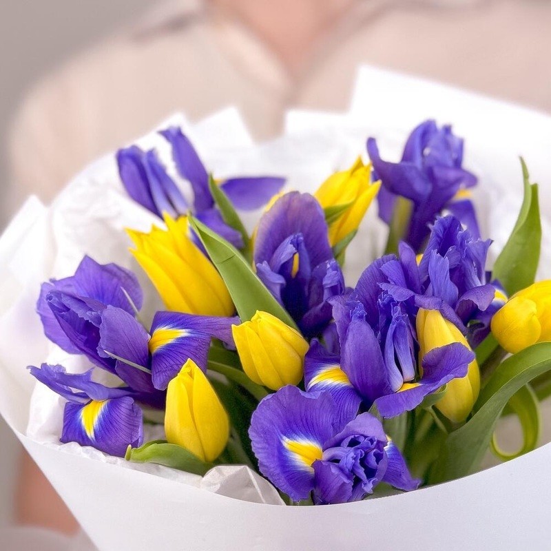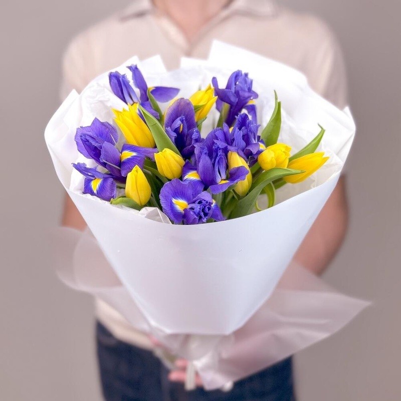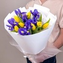 Этот нежный букет сочетает в себе тюльпаны и ирисы, создавая яркое и весеннее настроение. Он упакован в прекрасную атласную ленту и защищен от повреждений матовой пленкой. Идеальный подарок для любого случая!