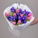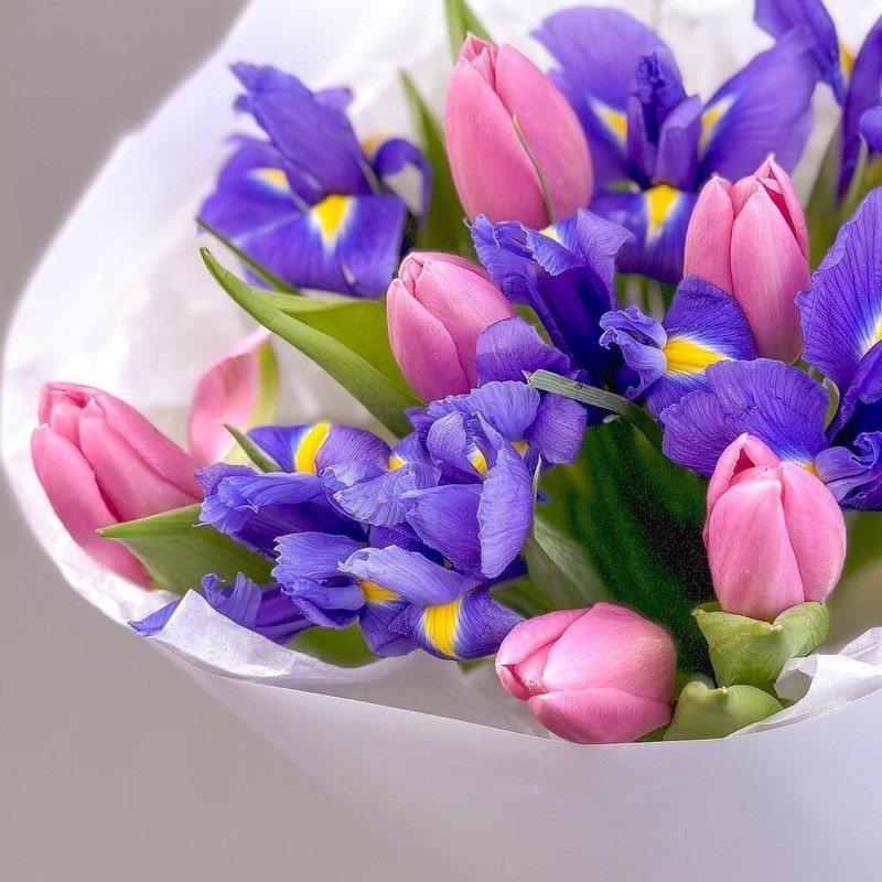 Этот утонченный букет состоит из нежных ирисов и элегантных тюльпанов. Каждый цветок дарит свежесть и радость, создавая атмосферу весеннего вдохновения. Благородная матовая пленка и изящная атласная лента завершают композицию, делая её еще более изысканной и привлекательной. Этот букет станет прекрасным подарком для особенного человека или просто ярким акцентом в интерьере.