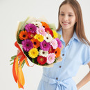 - Букет из 21 герберы микс с зеленью в дизайнерском оформлении 40 см