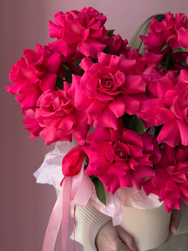 Шикарная монокомпозиция из ароматнейших французских роз сражает наповал всех: получателя, дарителя, а также всех, в чье поле зрения она попадает. Каждый лепесток розы вывернут вручную по специальной технологии, это никак не влияет на стойкость цветов.