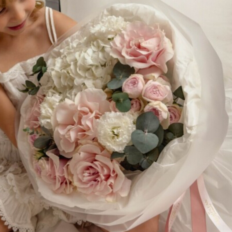 Букет из нежных роз, гортензии, диантусов. Идеален как нежное напоминание о ваших чувствах. Хит в день матери как подарок любимой жене