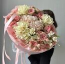 Шикарный букет для особенного повода. Французские розы с огромным бутоном, шикарные кустовые пионовидные розы, пышная гортензия и альстромерии. Букет выглядит богато, статусно и эффектно