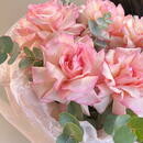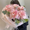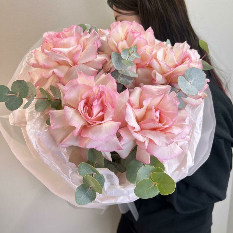 - Букет живых цветов из розовых французских роз и веточек эвкалипта