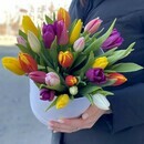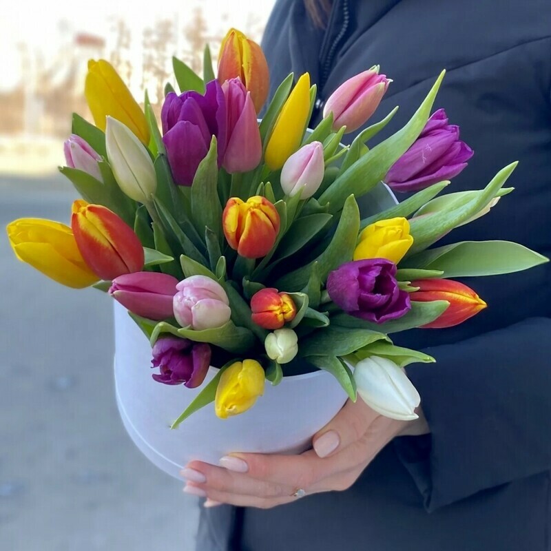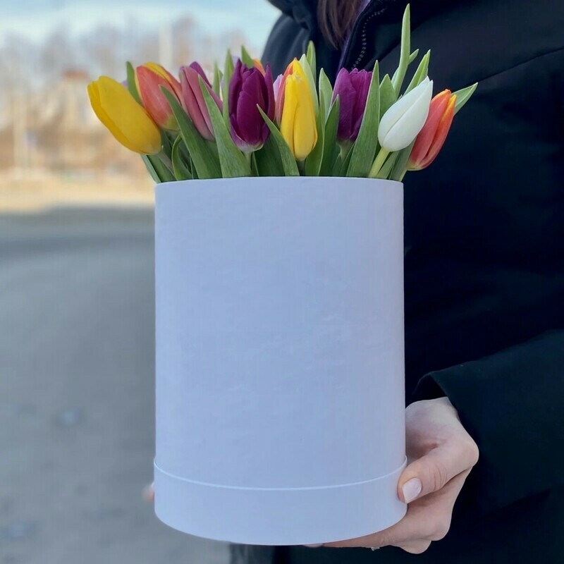 Коробка с разноцветными тюльпанами, настольная композиция, не требует вазы, но требует ежедневного полива. Преподнесите такую композицию в качестве презента своим любимым людям. Прекрасный подарок к 8 марта.