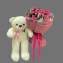 Buket «Syurpriz s mishkoj» — kustovie rozi i evkalipt