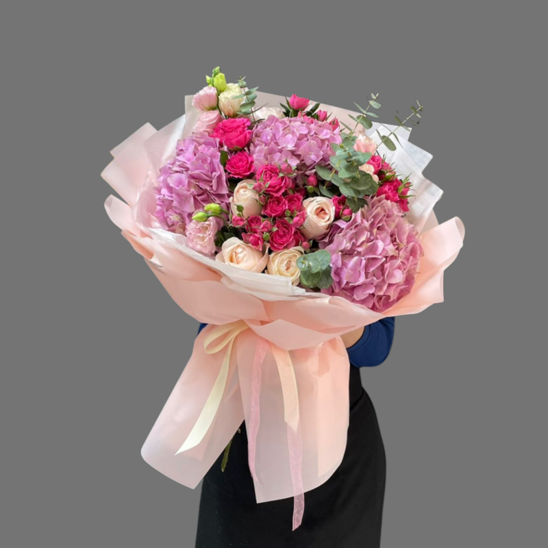 Buket «Rozovoe oblako» — gortenzii, rozi i liziantusi
