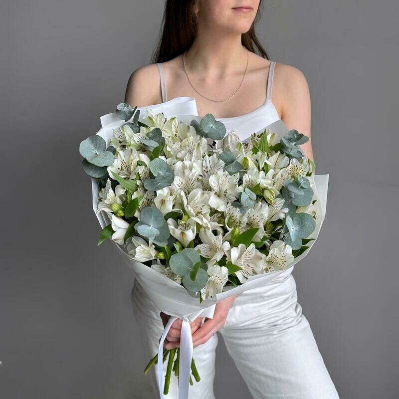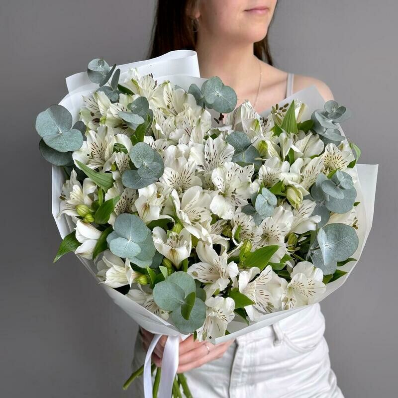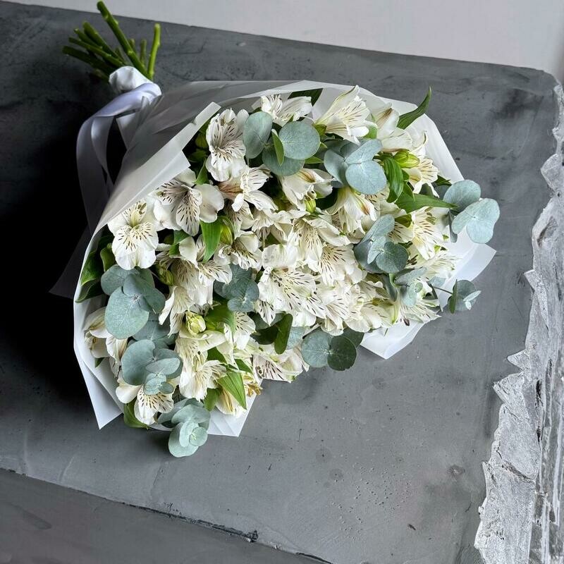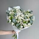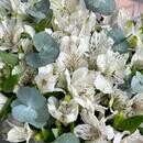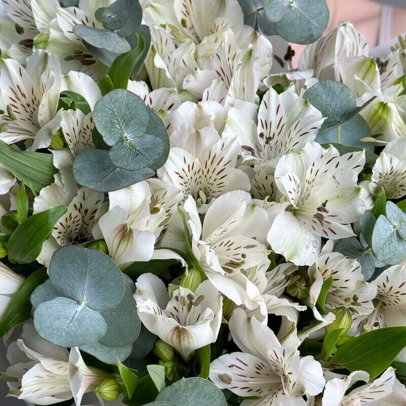 Sostav: evkalipt cineria - 8 sht, al_stromeriya belaya - 15 sht. Razmer: shirina - 42 sm, visota - 50 sm.