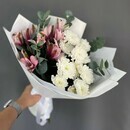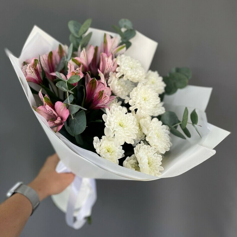 Nezhnij buket hrizantema, rozovaya al_stromeriya i evkalipt
