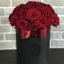 Sochetanie krasnogo i chyornogo- eto klassika. Buket v stil_noj chyornoj shlyapnoj korobke luchshee priznanie v lyubvi