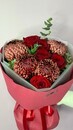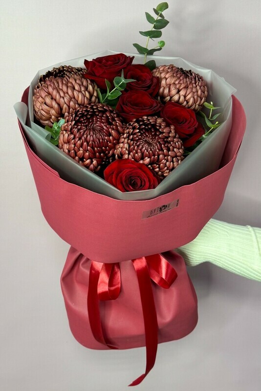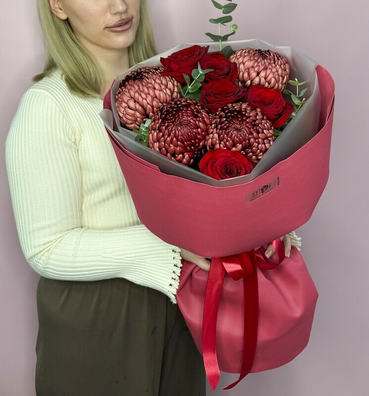 - Buket iz krasnih roz i odnogolovih hrizantem bordo