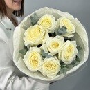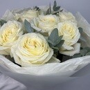 - Buket iz 7 kremovih pionovidnih roz s evkaliptom