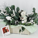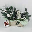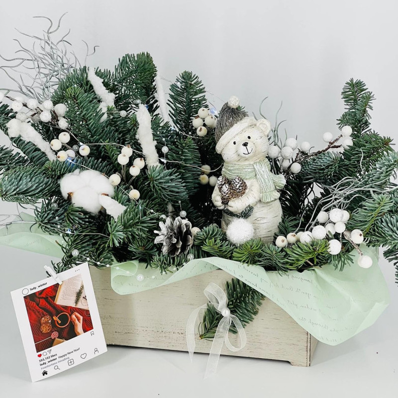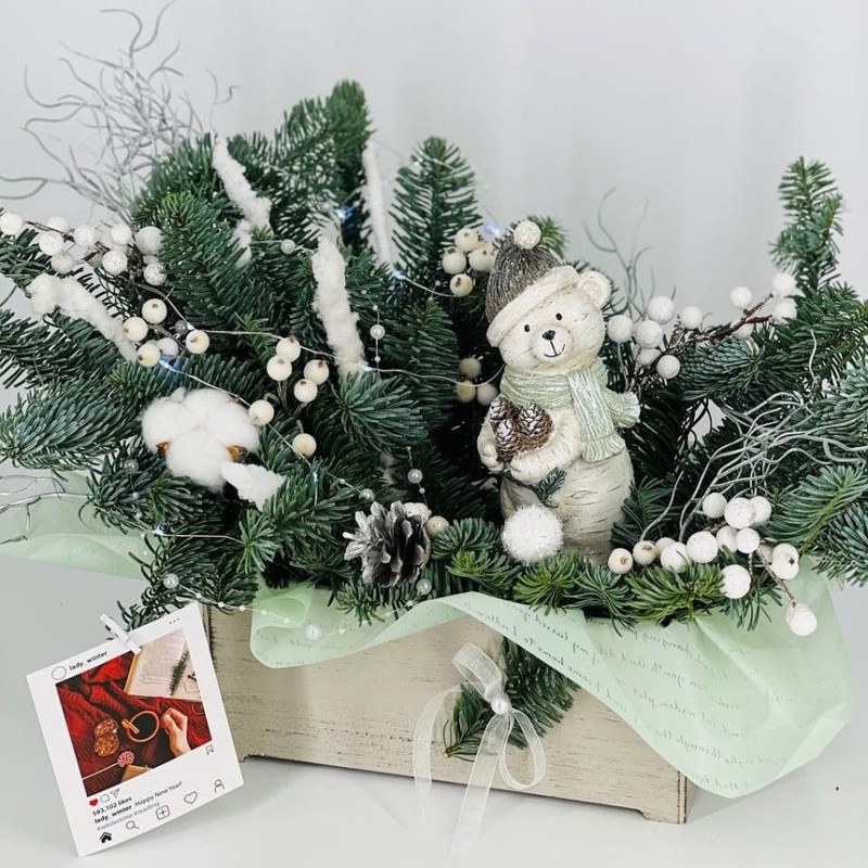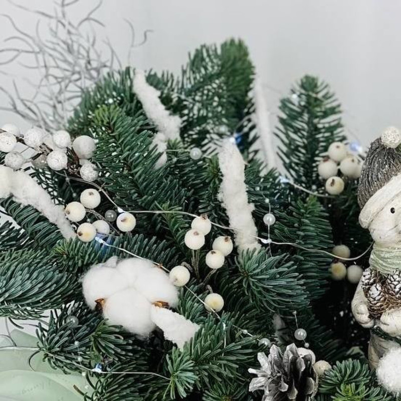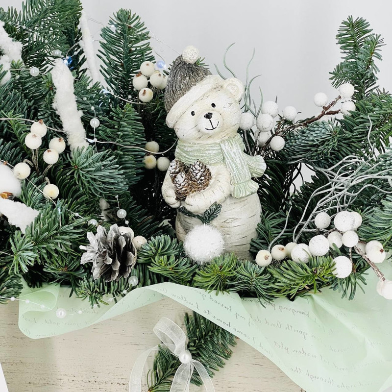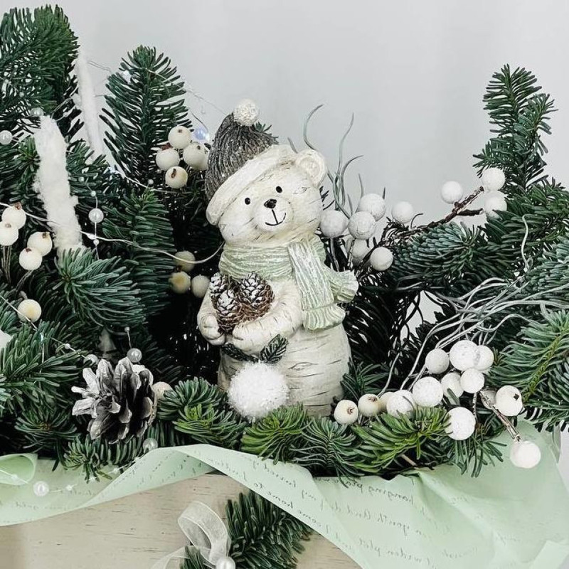 Buket iz vetok hvoi nobilis na stol s figurkoj "Medvezhonok v shapke", standart
