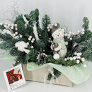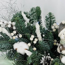 Buket iz vetok hvoi nobilis na stol s figurkoj "Medvezhonok v shapke"
