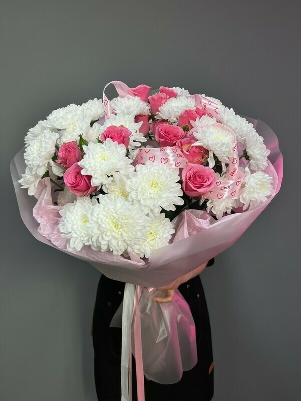 - Buket yarkij s hrizantemoj i kustovoj rozoj