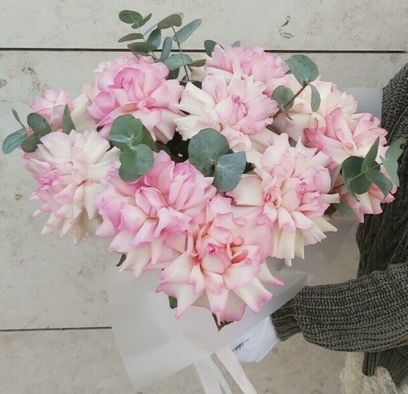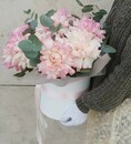 pogruzites_ v mir utonchennoj elegantnosti s nashej voshititel_noj kompozitciej v shlyapnoj korobke! predstav_te sebe moment, kogda pered vami otkrivaetsya eto roskoshnoe tvorenie, napolnennoe nezhnim aromatom frantcuzskih roz i volshebnim sharmom blagorodnogo evkalipta. Kazhdij buton, slovno dragotcennij kamen_, siyaeti svoej nepovtorimoj krasotoj, sozdavaya atmosferu volshebstva i romantiki.
