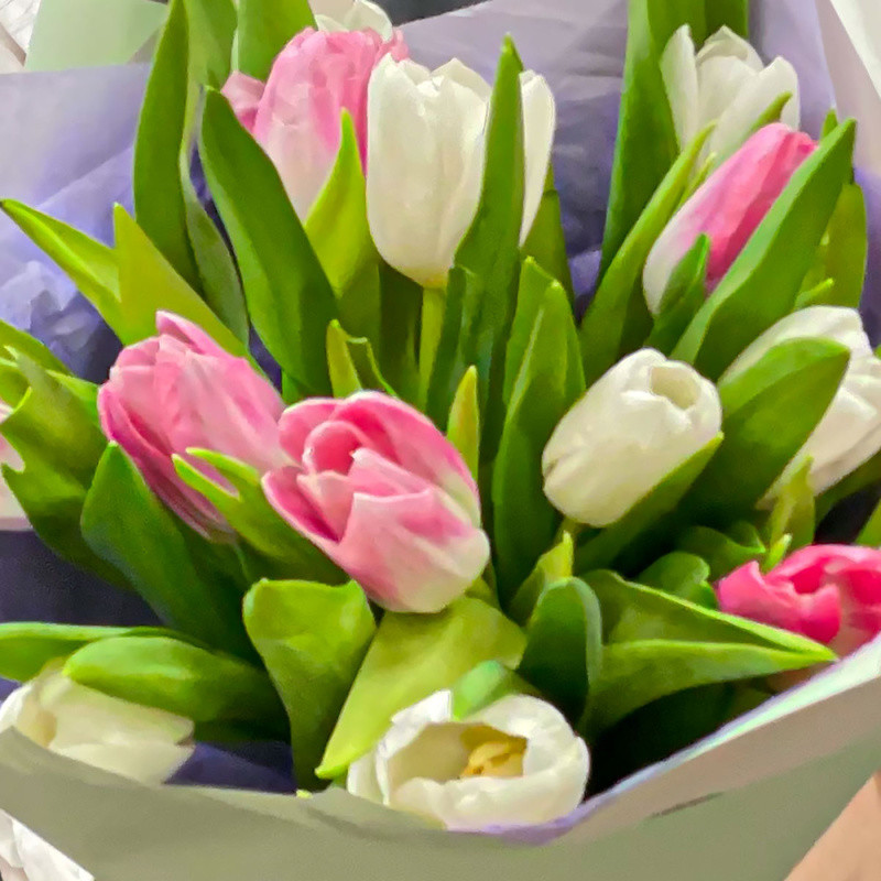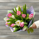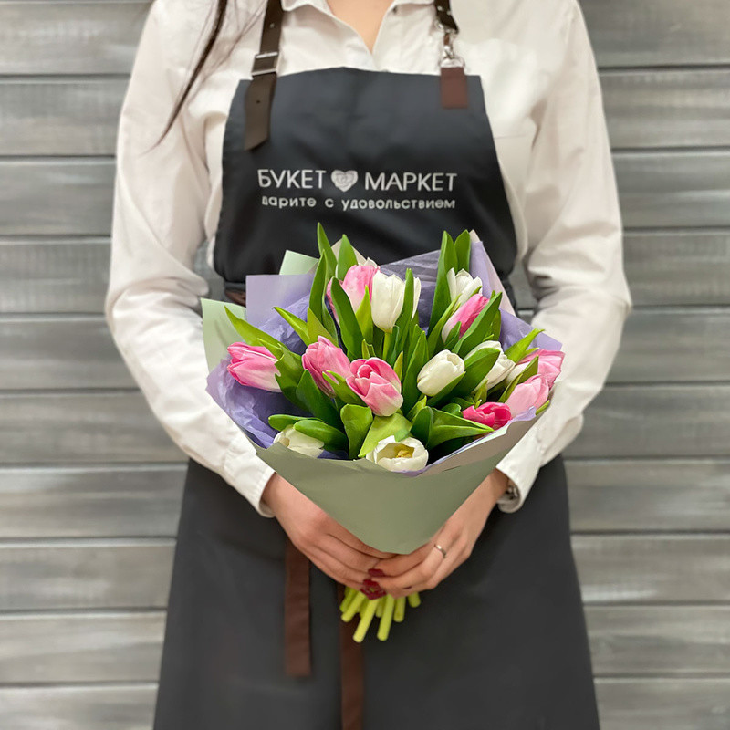 Buket iz 15 rozovih i belih tyul_panov v upakovke, 15 tyul_panov