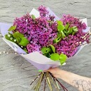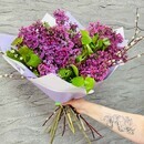 Siren_ krupnaya. Buket aromatnoj sireni v dizajnerskoj upakovke c vetochkami verbi. ZHivie tcveti