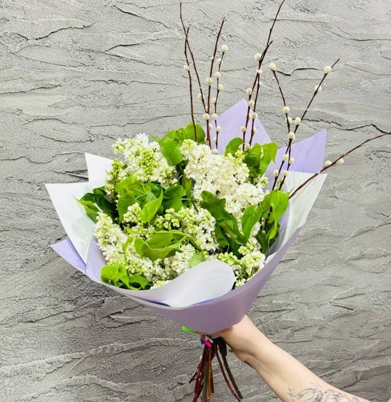 - Buket iz beloj sireni i vetochek zhivoj verbi. Belaya aromatnaya siren_