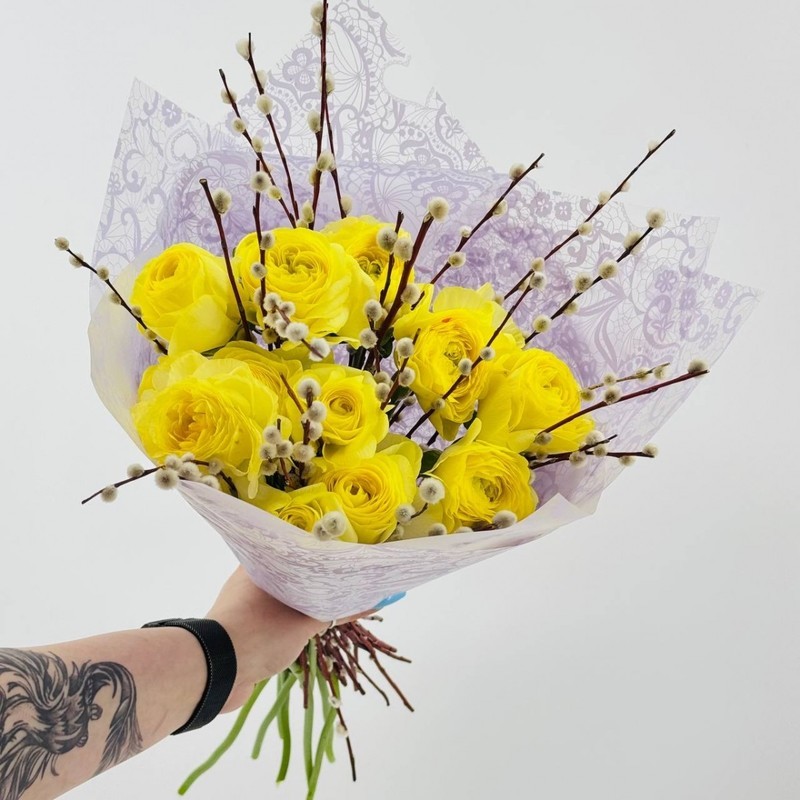 - Buket iz zhyoltih ranunkulyusov lyutikov v dizajnerskoj upakovke. Pashal_nij buket