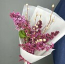 Buket aromatnoj sireni s vetochkami zhivoj verbi v dizajnerskoj upakovke. Pashal_nij buket, standart