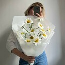 Buket belih sadovih romashek v dizajnerskoj upakovke. TCveti krupnie romashki 13 sht, standart