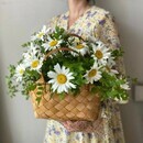 Dizajnerskaya pletyonaya sumochka s belimi sadovimi romashkami. TCveti v sumochke. Buket romashek, standart