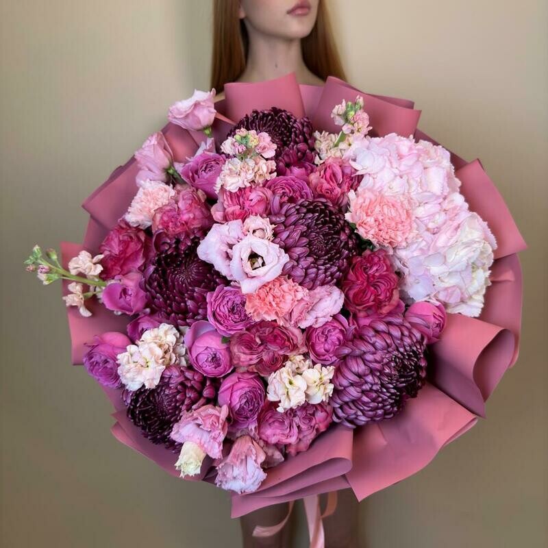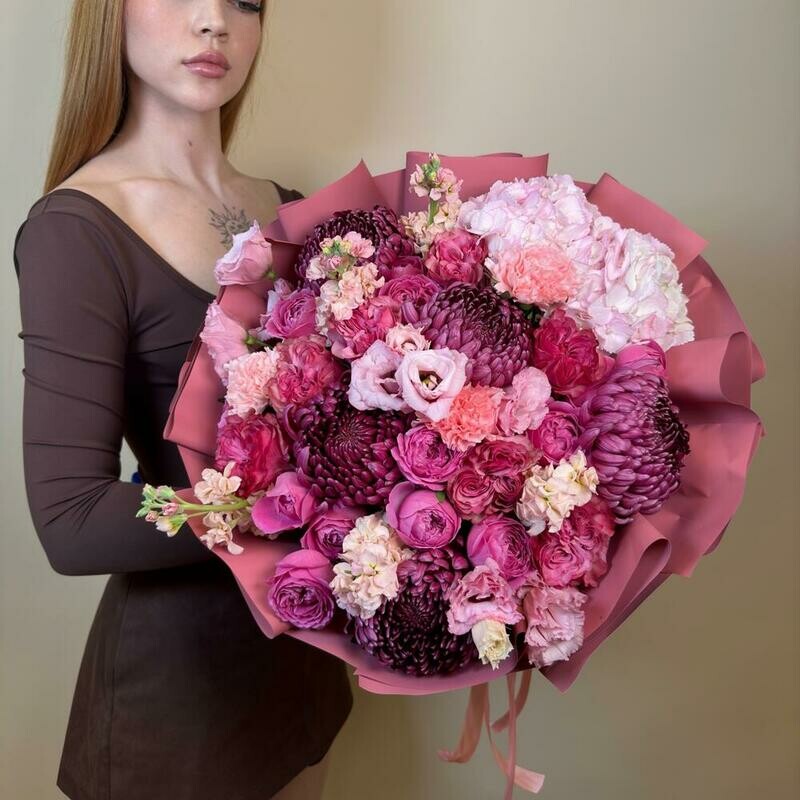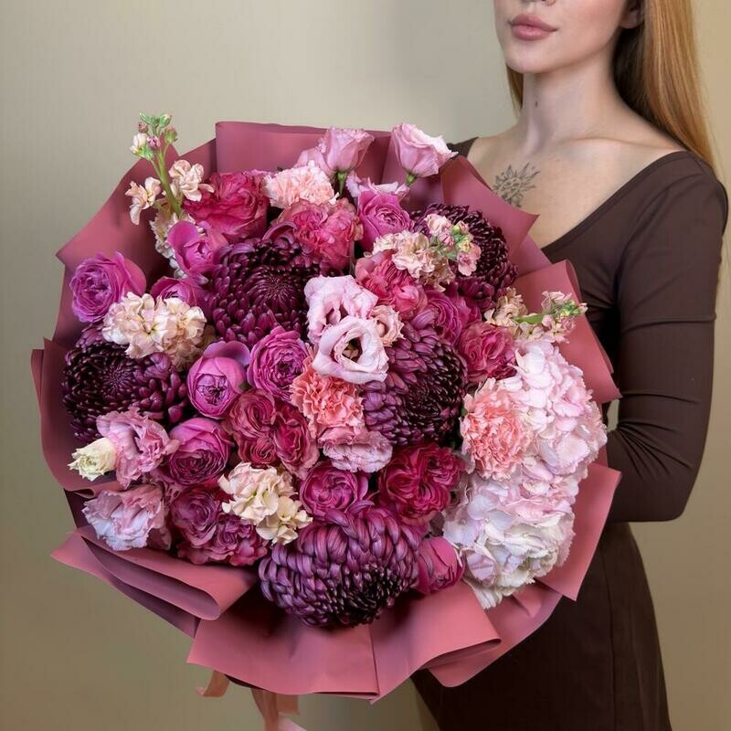 PREMIUM Avtorskij buket s hrizantemoj bigudi i rozovoj gortenziej