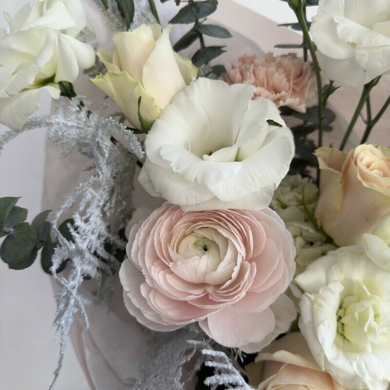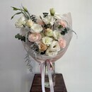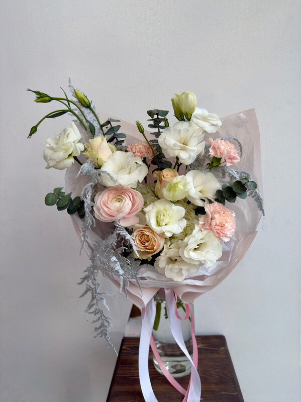- Avtorskij buket s gortenziej, eustomoj, rozami i diantusami