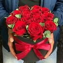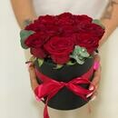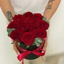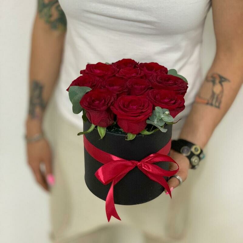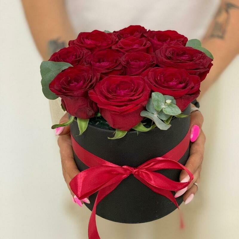 11 krasnih roz s evkaliptom v shlyapnoj korobke, tcveti v korobke