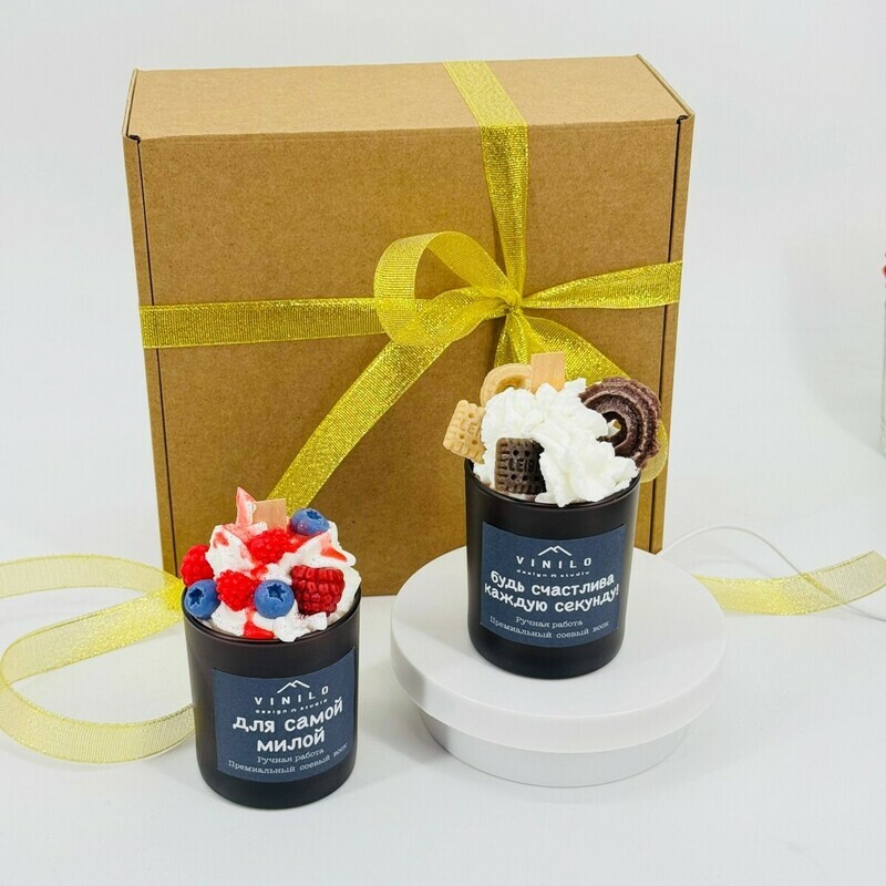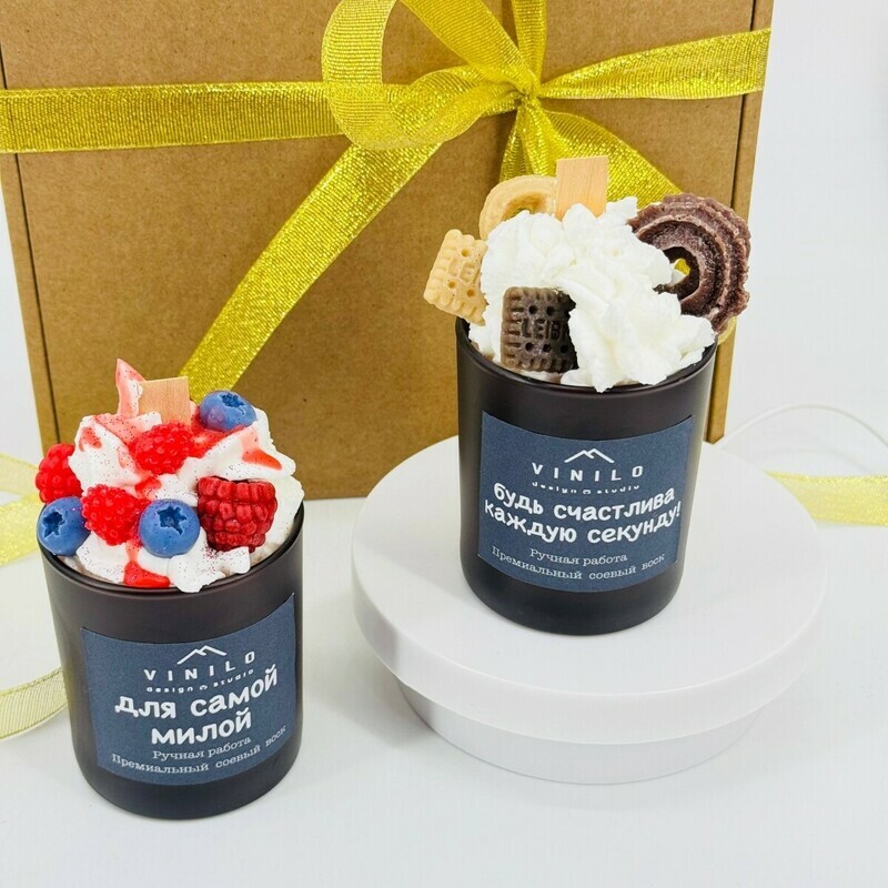 Podarochnij nabor svechej v stakane ruchnoj raboti. Svecha vzbitie slivki, standart