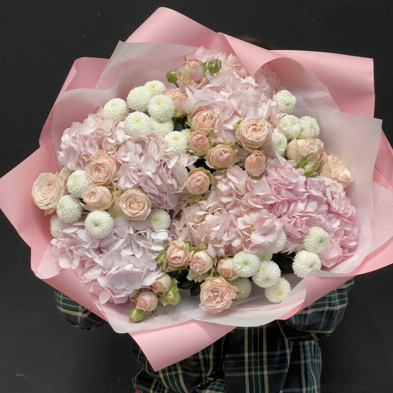 Nezhnij Buket iz gortenzii s pionovidnami rozami i premium hrizantem