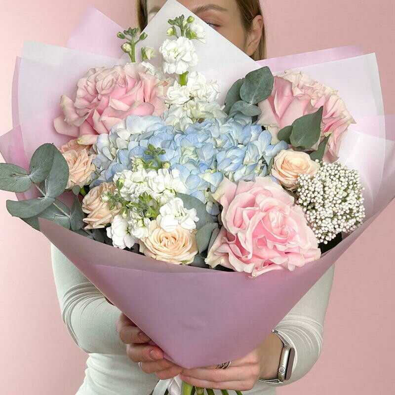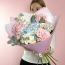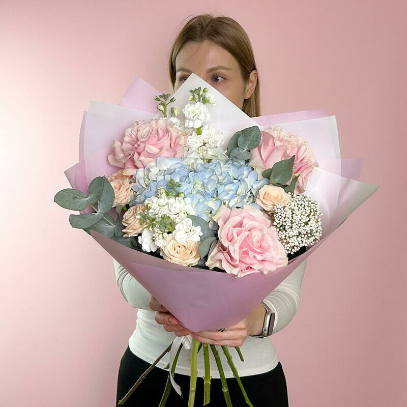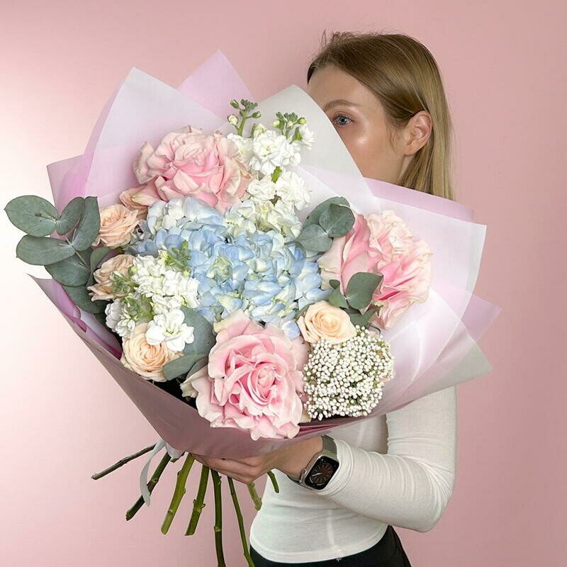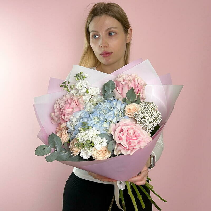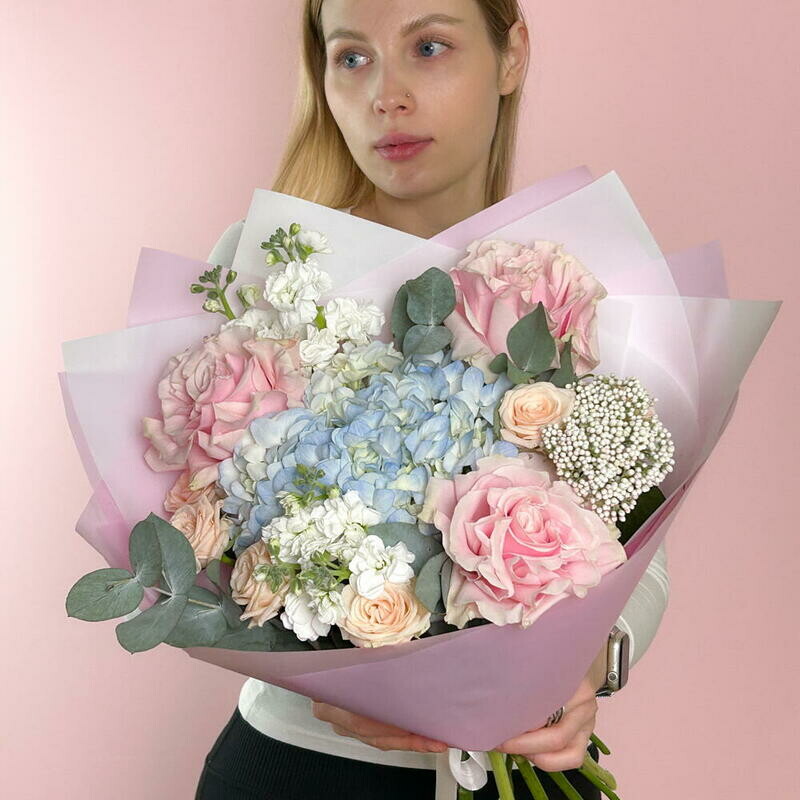 Nezhnij avtorskij buket s goluboj gortenziej