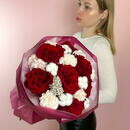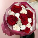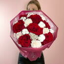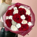 - Avtorskij buket s krasnimi frantcuzskimi rozami, diantusom i hlopkom