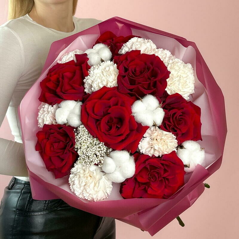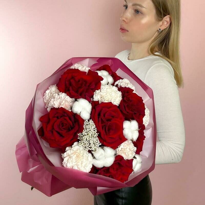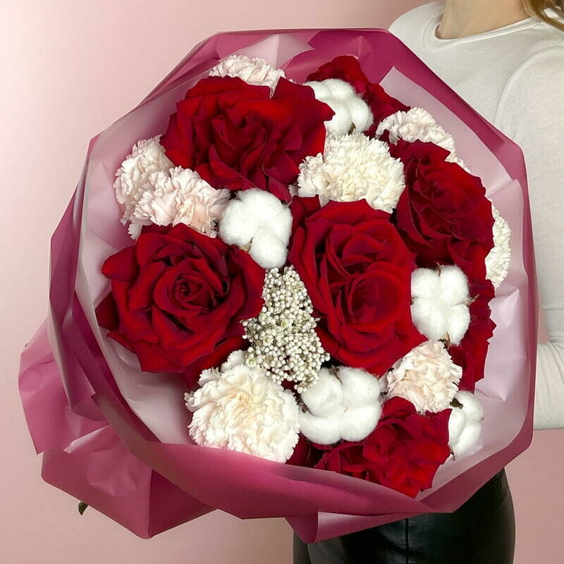 Avtorskij buket s krasnimi frantcuzskimi rozami, diantusom i hlopkom