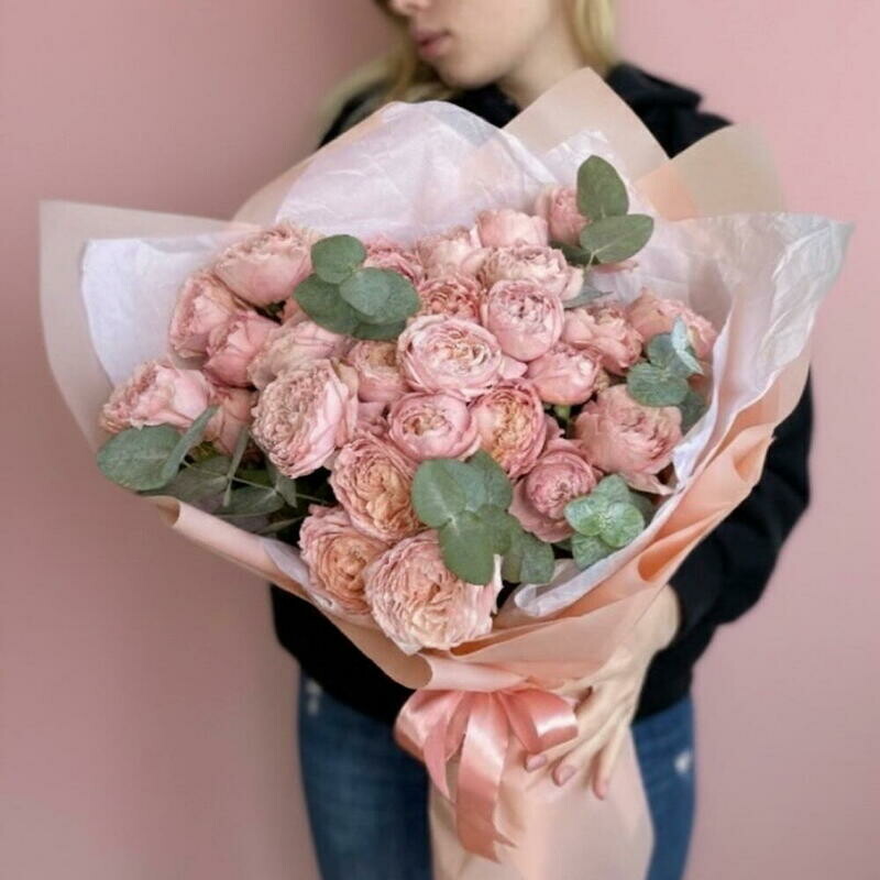 Buket iz pionovidnoj kustovoj rozi v nezhnih ottenkah
