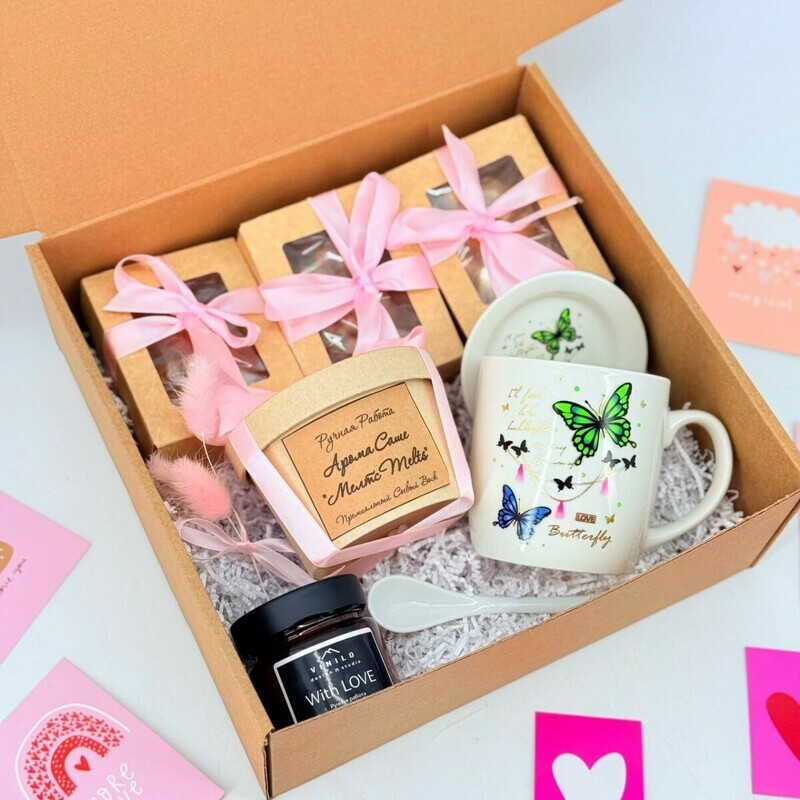 Podarochnij nabor dlya devushki s orehami, kruzhkoj, aroma sashe melts i svechoj ruchnoj raboti