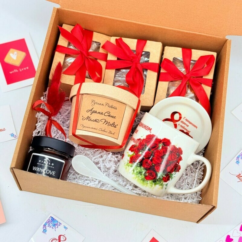 Podarok na 8 marta. Podarochnij nabor. Orehi v shokolade, kruzhka, aroma sashe melts i svecha v banke, standart