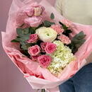«Konfetnij potceluj» dizajnerskij buket s kruzhevnim ranunkulyusom