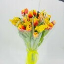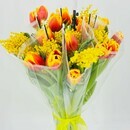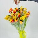 Dizajnerskij buket tcvetov v zontike. TCveti tyul_pani i mimoza. Buket tyul_panov s mimozoj, standart
