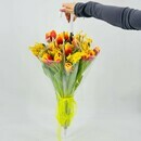Dizajnerskij buket tcvetov v zontike. TCveti tyul_pani i mimoza. Buket tyul_panov s mimozoj